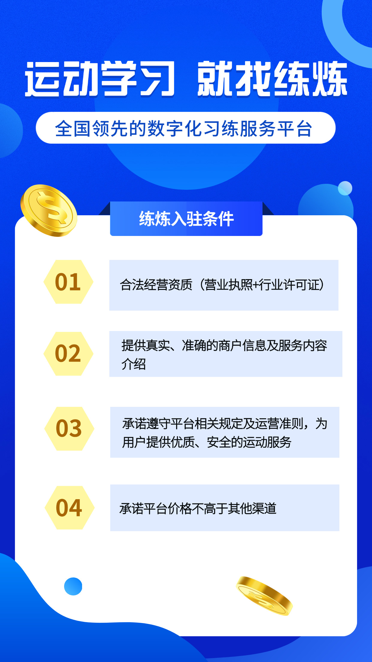 对于舞蹈、瑜伽、艺术培训、智力开发、体育训练等各类场馆与机构而言,入驻练炼平台无需承担任何成本压力 ——零押金、零技术服务费、零入驻费用的 “三零政策”,彻底打破传统平台的合作壁垒。只需具备合法经营资质,提供真实的商户信息与服务内容,承诺遵守平台规范并保障服务品质,即可轻松开启数字化经营之旅。