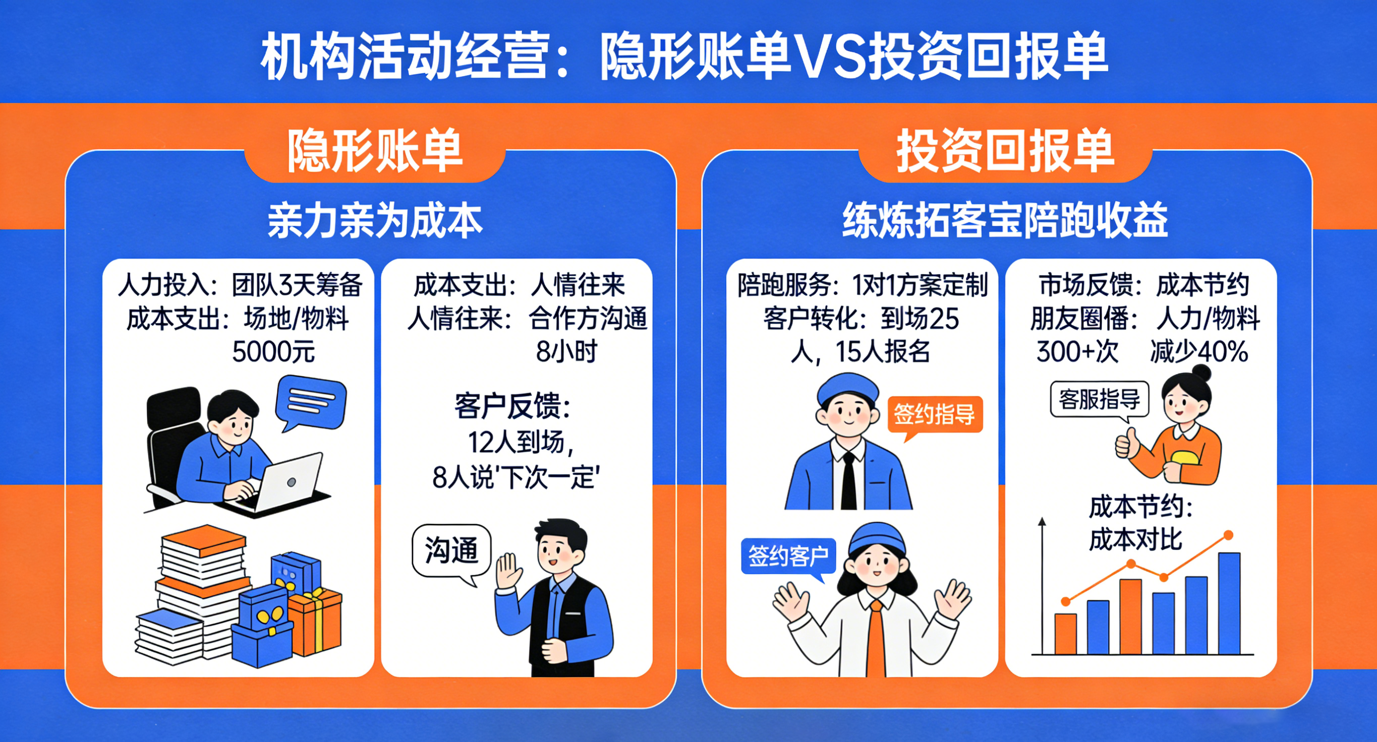 而今天,我们请您冷静算清两笔账:一笔是您亲力亲为的“隐形账单”,另一笔是使用练炼拓客宝陪跑的“投资回报单”。