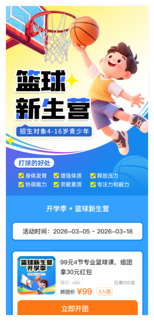 篮球训练营 → 报名600人,年卡转化180人 几乎零成本获客